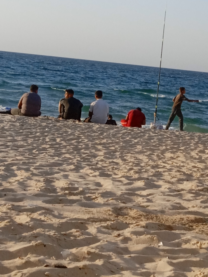 An outdoor wide shot depicts a coastal scene on a sandy beach in Al-Mawasi, Palestinian Territories