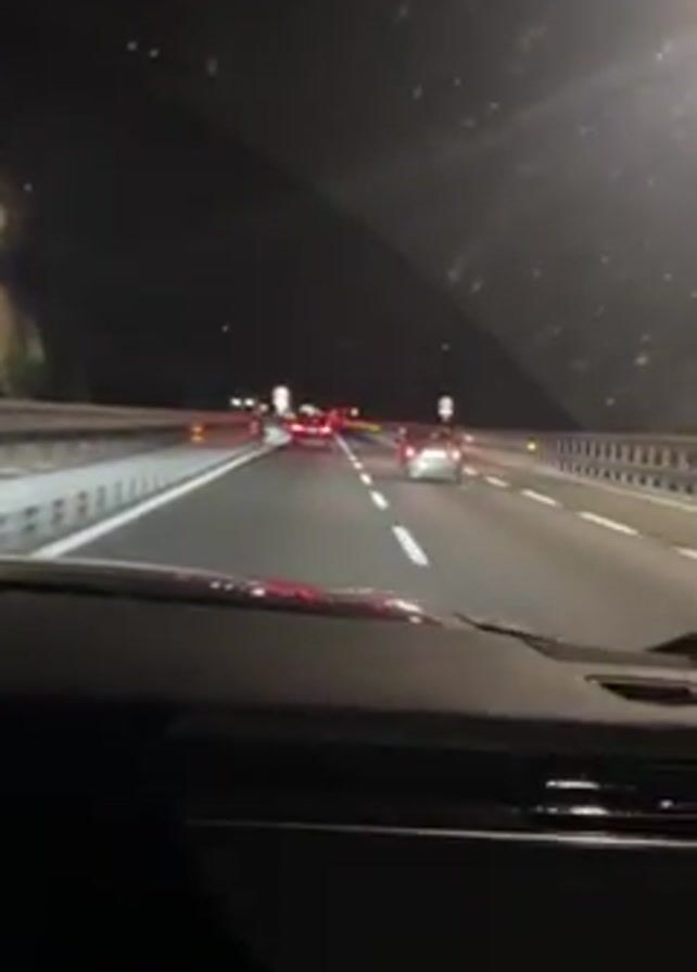 first-person view from inside a car driving on a highway at night. Other cars are visible ahead, their headlights and taillights illuminated. Streetlights are present along the roadside. The highway has multiple lanes, with white lane markings. The environment appears dark due to the night setting. No people are clearly visible inside the car. Music is playing in the background.