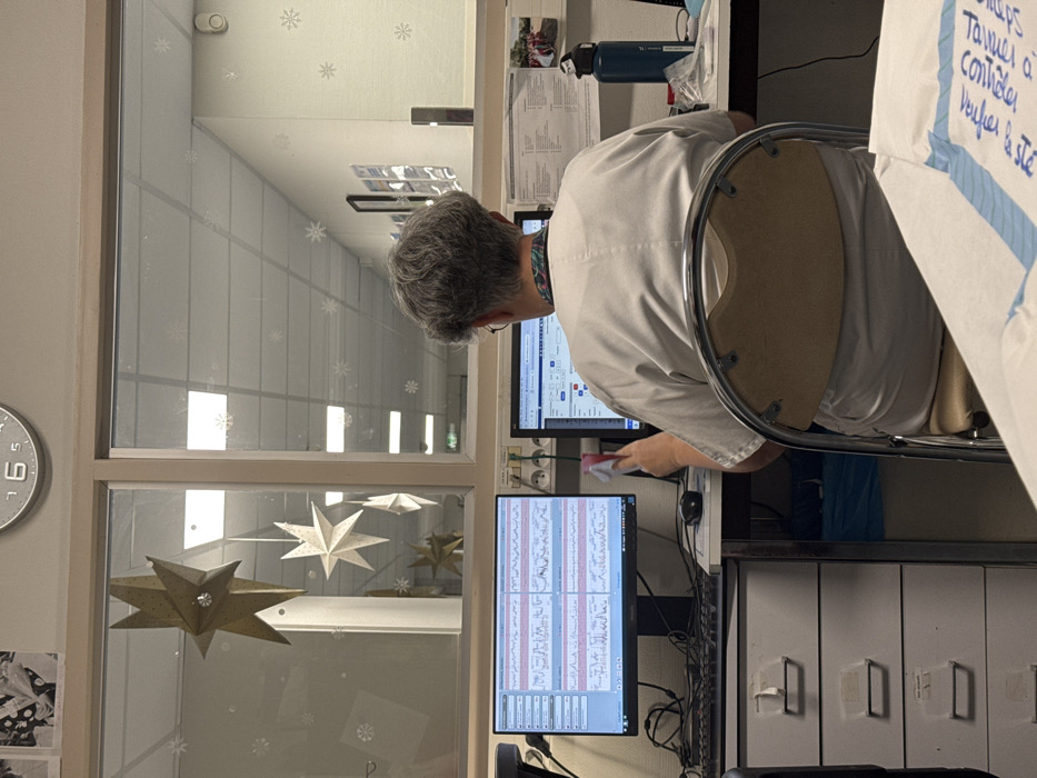 A person wearing a white coat sits at a desk with two computer monitors displaying graphs. The person is holding a small, pink item. The desk is near a window decorated with star-shaped ornaments and snowflake stickers. There's a clock on the wall, showing 6 o'clock. A metal chair is visible. Documents with handwritten notes hang on the right. A filing cabinet is next to the desk.