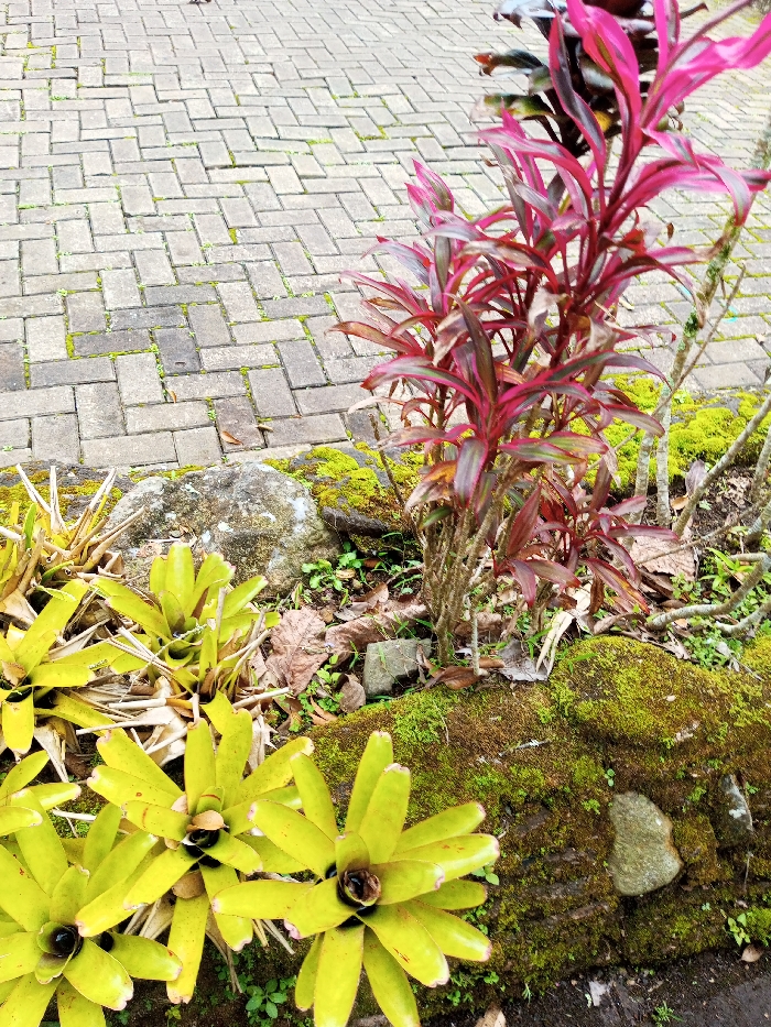 A brick walkway bordered by lush greenery. Yellow and green bromeliads with dark centers cluster near a moss-covered rock and a large gray rock. A vibrant red cordyline plant grows among the bromeliads, with a second one peeking in from the upper-right corner. The bricks are slightly mossy in places. Small stones and fallen leaves are visible between the plants.