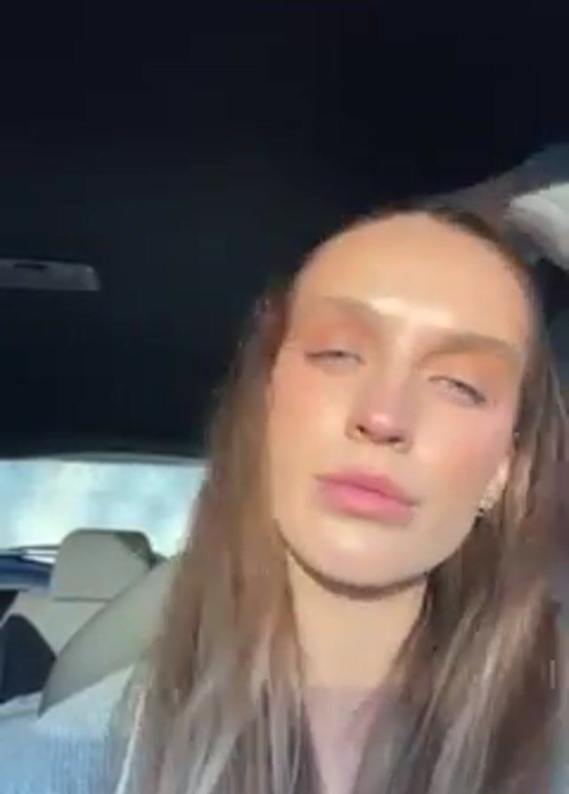 woman inside a car, seated in the driver's seat. She has long, straight, light brown hair, and is wearing light makeup with a neutral lip color. She is smiling and running her hand through her hair. The interior of the car is visible, and the lighting suggests it is daytime.