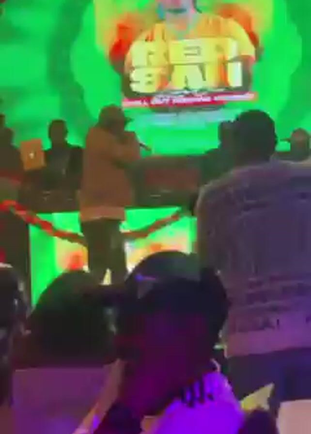A live musical performance is underway at what appears to be a nightclub or concert venue. A male performer wearing a tan jacket is on stage in front of a large screen displaying graphics and text "RED SAI". The lighting is colorful, with changing patterns on the screen. Several people are in front of the stage, some holding cell phones, possibly recording the performance. The environment is crowded, and the focus is on the stage and the performance.