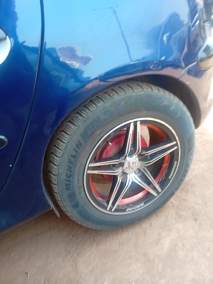 The image displays a close-up view of the rear passenger-side wheel and body panel of a dark blue vehicle. The vehicle's metallic paint finish reflects ambient light, with a localized scuff or abrasion visible on the rear quarter panel above the tire. The wheel consists of a Michelin Alpine tire, displaying 'Johnson Racing' text on its sidewall, mounted on a five-spoke alloy rim. The spokes are dark with polished accents, and the inner barrel of the rim is distinctively red. The vehicle is situated on an unpaved surface composed of reddish-brown soil. No individuals, specific actions, or definitive landmarks are present to precisely identify the location within Abuja, Nigeria; however, the ground type is common in unpaved areas of the city.