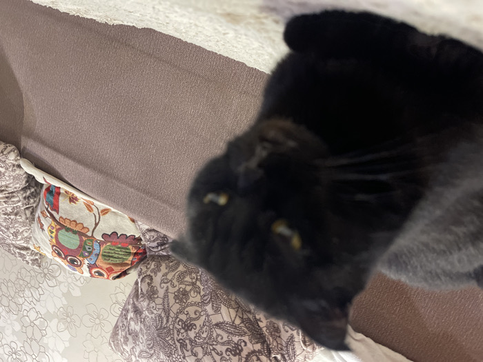 The scene depicts an indoor domestic environment located in Trudovoi, Russia. In the foreground, a black domestic cat is present, significantly out of focus. The cat is resting on a light-colored, textured, soft surface, likely a blanket or rug. Its yellow-amber eyes are partially visible, appearing to gaze slightly off-center. The immediate background features a sofa or bed covered in a plain, brown-mauve textured fabric. Positioned on this furniture are two distinct pillows: one large pillow with a beige background and a repeating brown paisley or floral pattern, and another smaller pillow with a cream background decorated with multiple colorful owl illustrations. Above the furniture, a section of a wall is visible, covered with light-toned wallpaper featuring a subtle, repeating floral or leafy design. No human subjects are visible.