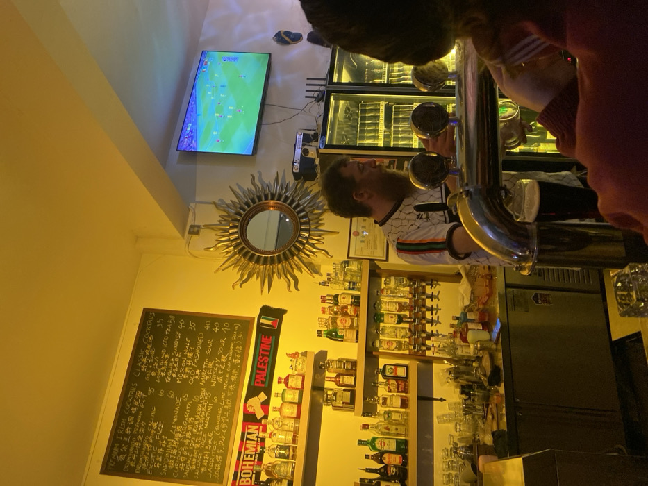 This image captures the interior of a bar in Liangjiang, China, illuminated by a warm, yellow light. A male bartender with a prominent beard, wearing a white shirt featuring black, green, red, and white striped accents, stands behind a polished stainless steel bar counter. He is positioned in front of a beer tap, from which a dark beer is being poured into a glass. The bartender's gaze is directed towards the right, suggesting engagement in conversation or observation. Behind the bartender, multiple wooden shelves display various liquor bottles. Above these shelves, a black menu board lists "PREMIUM IRISH COCKTAILS" and "CLASSIC COCKTAILS" with corresponding prices, detailed in both English and Chinese characters. Directly beneath the menu, a banner featuring the words "BOHEMIAN" and "PALESTINE" is affixed. To the right of the bar shelves, a large decorative sunburst mirror is mounted on the wall. Further right and higher, a flat-screen television is displaying a soccer match in progress. Two glass-fronted refrigerators containing beverages are visible behind the bartender. In the foreground, partially visible from the back, is a customer with dark hair wearing a red garment, seated at the bar and holding a glass. The bar counter contains various mixing tools, shakers, and empty glasses, indicating active service.