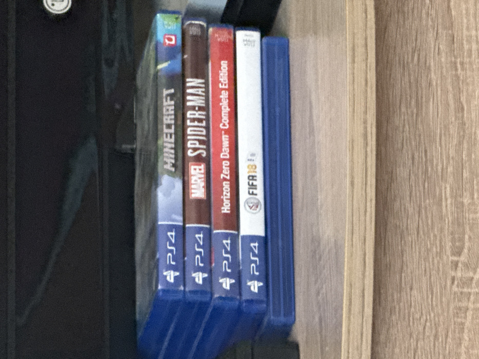 The image depicts an indoor scene in Nova Zagora, Bulgaria. The central focus is a vertical stack of five PlayStation 4 (PS4) video game cases resting on a light brown, wood-grain patterned horizontal surface. From top to bottom, the visible game titles are: "MINECRAFT" on a blue-spined case, "MARVEL SPIDER-MAN" on a brown-red spined case, "Horizon Zero Dawn™ Complete Edition" on a red-spined case, and "FIFA 18" on a white-spined case. The fifth case at the bottom has a blue spine with no title visible. In the background, behind the stacked cases, is a dark, indistinct horizontal surface, possibly a television or entertainment unit, exhibiting a faint, light-colored reflective streak and a partial circular "LG" logo in the upper right quadrant. No individuals are present, and no actions or interactions are depicted. The scene is static.