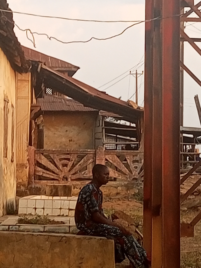 A person in a patterned shirt and pants sits on a low stone wall in front of a dilapidated building with a unique sunburst-patterned railing. Behind the building, an unfinished structure is visible, with a metal tower framing the right side of the image. Wires stretch across the top against a cloudy sky. The overall scene suggests poverty and disrepair.