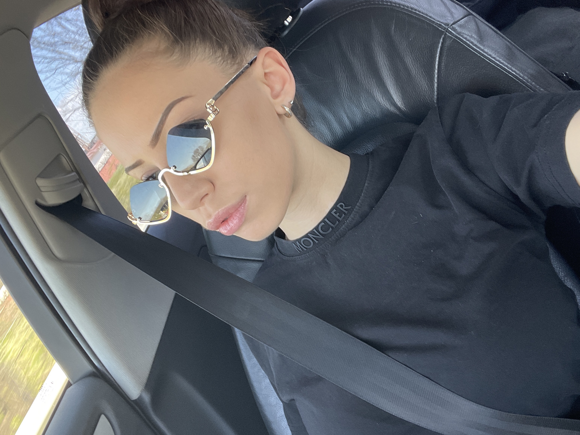 A light-skinned woman is seated in a car. She wears a black t-shirt, sunglasses, and a seatbelt. The seat is black leather. The location is unknown.