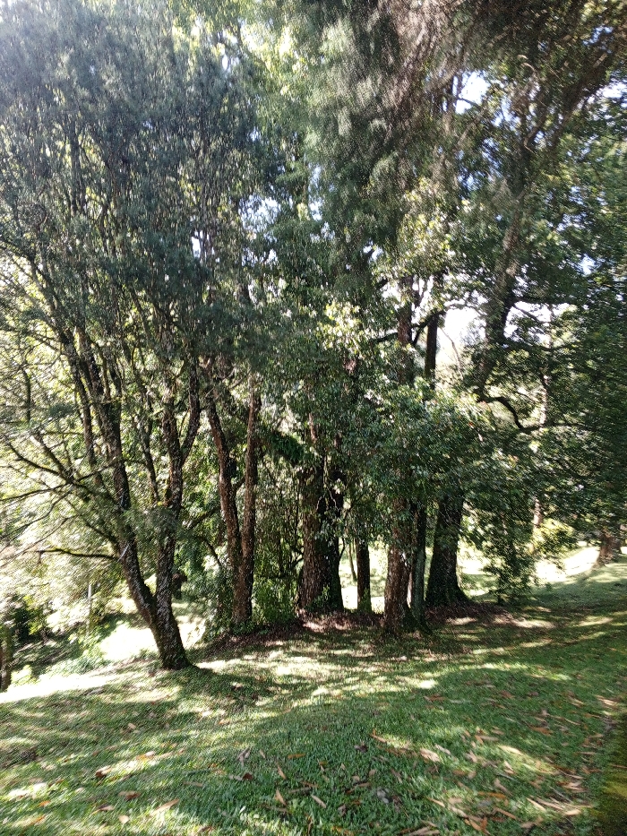 Lush greenery dominates the scene with a cluster of trees forming a dense canopy overhead