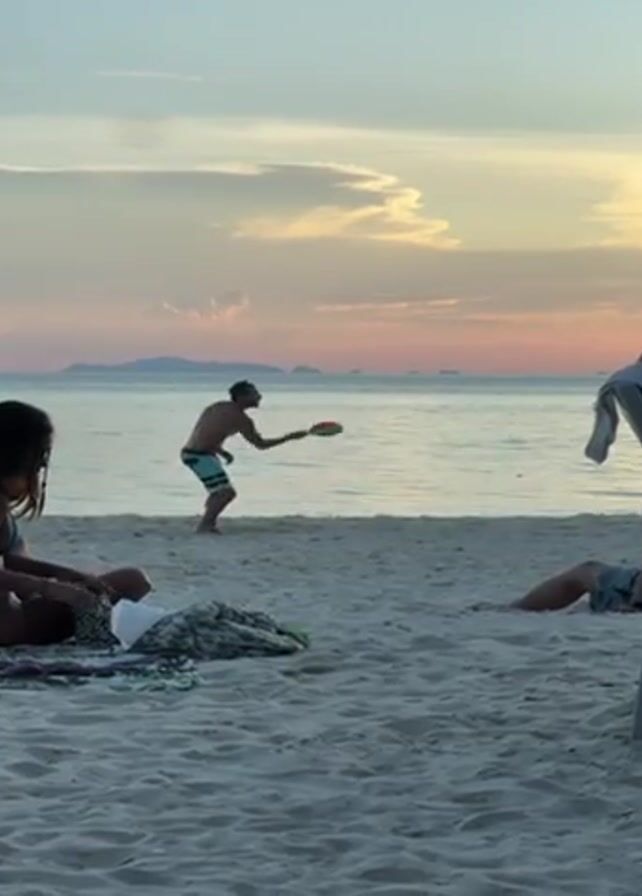 beach scene at sunset. There is a woman sitting on a towel in the foreground, looking down. Next to her, a person is lying down, partially obscured by a beach chair. Further back, a man is playing beach tennis, hitting a small ball with a paddle. The ocean is calm with a few distant islands visible against the colorful sunset sky.