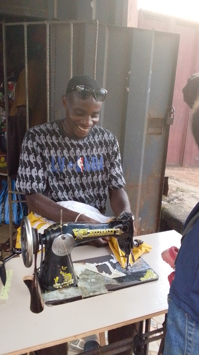 In Onitsha, Nigeria, a dark-skinned male subject, appearing to be in his mid-20s to early 30s, is seated and engaged in sewing