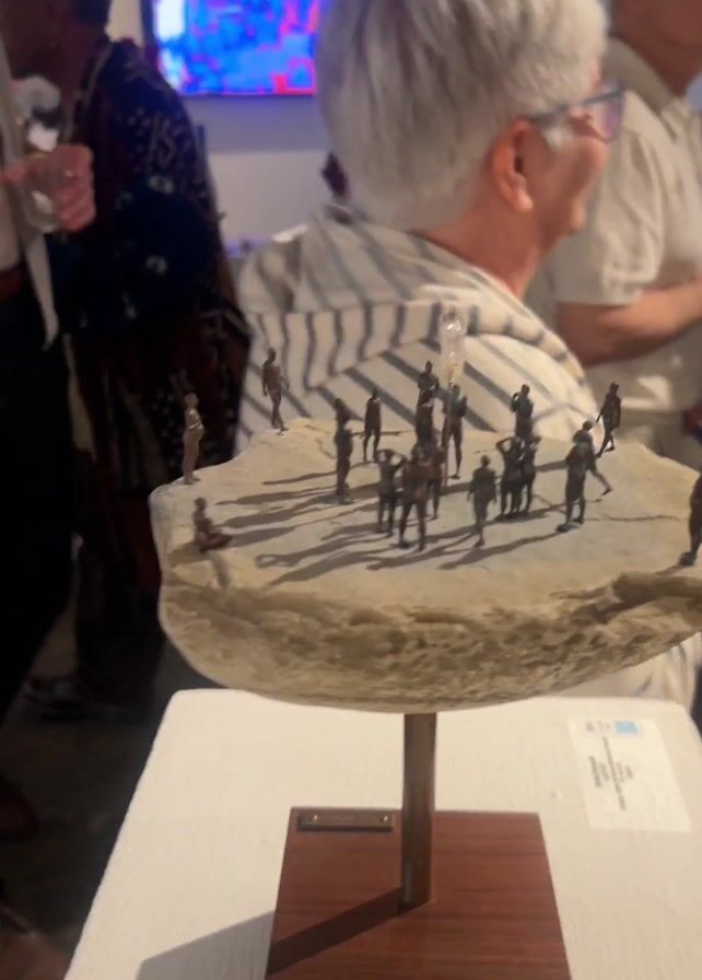 small art installation on a white table in an art gallery. The installation consists of a small, roughly circular stone, on which are arranged numerous miniature figures, seemingly bronze in color. In the center of the figures is a single clear crystal point, elevated above the figures. The stone is mounted on a thin metal rod, which is attached to a square wooden base. The camera circles the installation, showing a number of people in the background, looking at art. Some people are carrying drinks and chatting. The gallery appears to be well-lit, with other artworks visible on the walls.