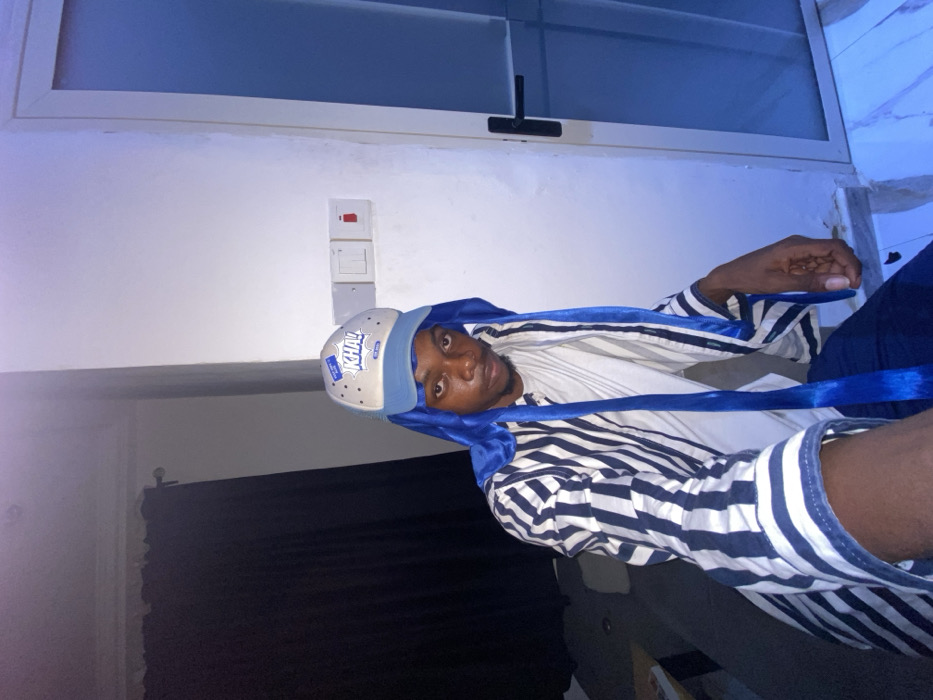 A person wearing a white t-shirt, a blue and white striped jacket, and a light-colored hat with blue trim and ties poses for a selfie. The background features a window with a black handle, a light switch on a white wall, and a dark curtain. The room appears to be dimly lit with a slightly blue hue. The subject looks directly at the camera.