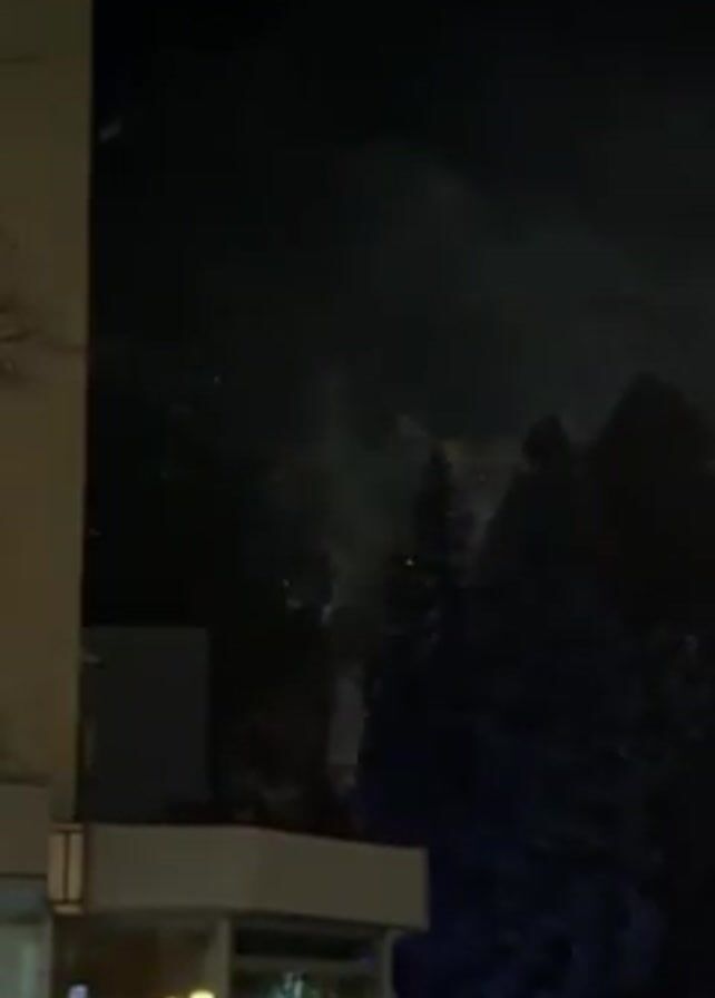 At night, the camera captures a fireworks display in an urban setting. A building is visible in the foreground on the left, with a flat rooftop. Trees are situated to the right of the frame. The sky is filled with bursts of light from the fireworks, exhibiting varied colors including red, white and gold. The fireworks are exploding behind the trees. The lighting is dim, typical of a night scene.