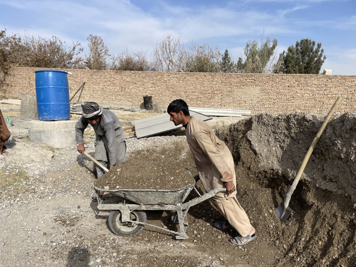 This image depicts an outdoor construction or excavation site in Nakhonay, Afghanistan, under a clear blue sky with sparse clouds