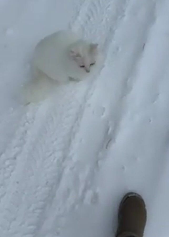 A short, high-angle shot shows a white cat sitting in the snow, with the feet of a person visible at the bottom of the frame