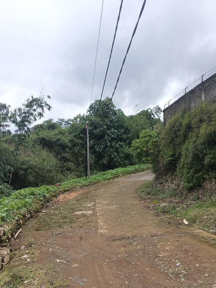 The image displays an unpaved road with interspersed concrete sections, ascending and curving slightly to the left, under an overcast sky, in Bagochen Boolingpang Ueling, Bhutan. A wooden utility pole with multiple dark electrical or communication wires extends diagonally across the upper portion of the frame from left to right. To the immediate left of the road, a strip of cultivated green plants borders a densely vegetated hillside dominated by trees, including bamboo. On the right side of the road, a low stone retaining wall supports an embankment of sparse greenery, which then transitions to a grey concrete block wall topped with barbed wire. Beyond this wall, more dense green foliage is visible. No individuals, vehicles, or animals are present.