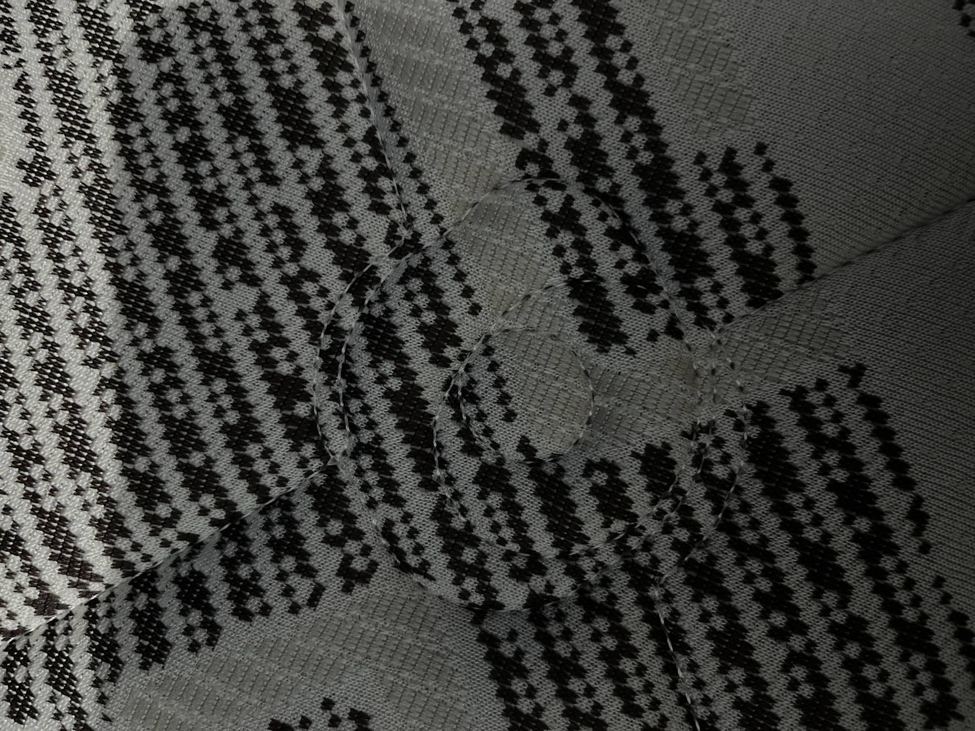 close-up of patterned fabric. The fabric has a repeating pattern of black geometric shapes on a gray background. There is a seam or a stitched detail visible in the center of the image, creating a slight depression in the fabric. The lighting is subdued, with shadows present. There is no information relating to the city of Lhokseumawe, Indonesia in the image. No people, other subjects, objects, actions, or interactions are visible.