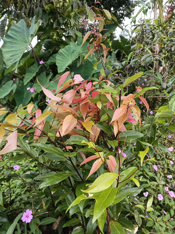 The scene is an outdoor, natural environment located in the city of Unknown, Vietnam, characterized by dense, lush vegetation. The foreground is dominated by a shrub with numerous lanceolate leaves, featuring a mix of mature dark green foliage and new growth exhibiting vibrant reddish-pink, orange, and light brown hues concentrated towards the upper branches and tips. The plant stems are slender and dark. In the midground, behind the central shrub, smaller plants with dark green leaves and several scattered, small, five-petaled light purple-pink flowers are visible. The background consists of a dense arrangement of larger tropical plants, including prominent broad, dark green leaves resembling taro plants, and a canopy of various green tree foliage. No individuals, animals, or man-made objects are present. The lighting is diffused and even, indicating an overcast condition.