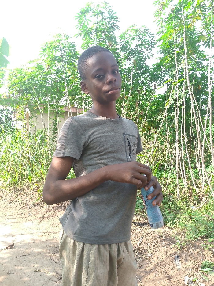 A young male subject, approximately 10-14 years old, stands outdoors in an unpaved area in Unknown, Unknown