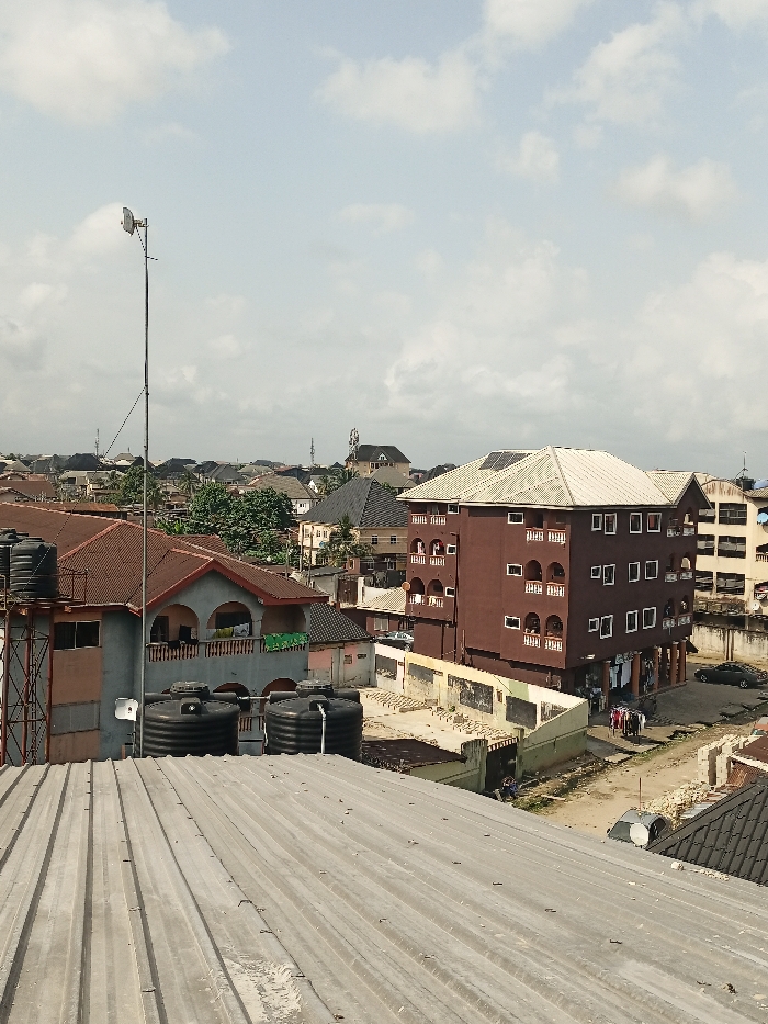 This image captures a wide-angle, elevated view of a densely packed urban area in Aba, Nigeria, under a partially cloudy sky. In the immediate foreground, a corrugated metal roof dominates the lower third of the frame, showing signs of wear. Directly beyond this, four black plastic water tanks are visible; two are positioned on a lower structure, and two are elevated on a metal frame to the left. The midground features several buildings. To the left, a two-story structure with a light blue-grey painted facade and a reddish-brown tiled roof includes an arched balcony on its upper level, where green fabric is hanging to dry. A tall, slender metal mast, equipped with a dish antenna, rises directly behind this building. To the right, a prominent four-story residential or commercial building with a dark brown facade features numerous white-framed windows and multiple arched balconies. Its light-colored gabled roof appears to have several dark panels, possibly solar installations. On the ground floor of this brown building, clothing racks displaying garments are visible, suggesting a commercial establishment. An unpaved, dusty street or alley runs between the light blue-grey building and the brown building. A dark-colored sedan is parked on this street, partially obscured. A small group of approximately five individuals are standing on the unpaved street near the entrance of the brown building. The background presents a sprawling cityscape with numerous buildings of varying heights and architectural styles, predominantly residential, under similar tiled or metal roofs. Scattered trees provide minimal greenery. Several communication towers or similar tall structures are visible on the distant horizon, which appears hazy.