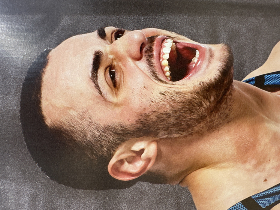 A single adult male is depicted in a close-up, chest-up portrait, positioned against a plain, dark gray, textured background. The subject has short, dark hair, a trimmed dark beard, and a mustache. His face is turned slightly to the right, with his mouth wide open in an expression suggestive of laughter or shouting, revealing upper and lower teeth; some upper front teeth show a yellowish discoloration. His dark eyes are partially visible, with crinkled skin at the outer corners. The subject's neck is muscular, and the skin on his left neck and upper chest area exhibits some redness. He is wearing a black athletic top with a blue striped or patterned design, visible on his left shoulder and upper chest. The scene is situated in Vratsa, Bulgaria.