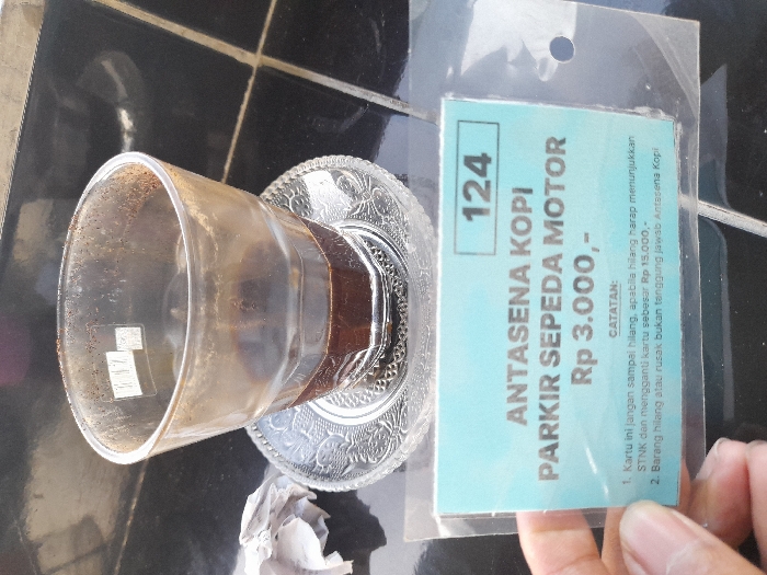 The image captures a close-up, elevated perspective of a clear glass of partially consumed dark coffee on a decorative glass saucer, situated on a dark, tiled surface in Penanggungan, Indonesia. Visible within the glass are coffee grounds adhering to the upper interior rim, and a small, illegible white label on the exterior near the top. To the left of the glass, a small piece of crumpled white paper rests on the tiled surface. In the lower left foreground, a human hand with light to medium skin tone holds up a laminated, light blue rectangular card. This card functions as a motorcycle parking ticket from "Antasena Kopi," identified by text that includes "ANTASENA KOPI PARKIR SEPEDA MOTOR Rp 3.000,-" (Motorcycle Parking Rp 3,000,-), and the number "124" in a box at the top right. Notes on the card specify a Rp 15,000,- replacement fee for a lost card upon showing vehicle registration (STNK) and state that Antasena Kopi is not responsible for lost or damaged items. The dark tiled surface shows visible grout lines and a subtle sheen.
