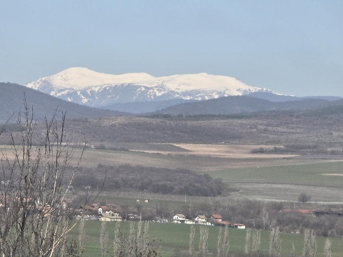 The image displays a panoramic landscape scene centered on the city of Rupkite, Bulgaria. In the far background, a range of snow-capped mountains is visible under a clear, light blue sky. These mountains exhibit significant white snow cover with darker, exposed rock or vegetation patches. Closer to the foreground, a series of lower, undulating hills covered in dormant, dark vegetation or bare deciduous trees extends across the mid-distance. The midground features a valley containing segmented agricultural fields; some appear green with vegetation, while others are brown or fallow. Clusters of bare deciduous trees are scattered throughout this area. The city of Rupkite is situated in the lower midground, primarily on the left side of the frame. It comprises several residential structures with light-colored facades and reddish-brown tiled roofs. A linear arrangement of buildings, possibly indicative of a road or street, is discernible. A few indistinct vehicles are present near these structures. Tall, slender, bare trees, possibly poplars, are planted in rows in the lower right midground. In the immediate foreground, on the left side, the intricate network of dark, bare branches from a deciduous tree partially obstructs the view of the settlement and midground. No individuals are visible, and no actions or interactions are depicted. The scene is illuminated by natural daylight.