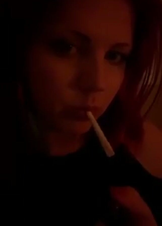 A woman with pinkish-red hair, a black top, and tattoos on her hands is seen holding a lit cigarette in her mouth. She looks directly at the camera as she lights the cigarette with a lighter, then moves the cigarette to her tattooed hand. The scene is dimly lit with red hues.