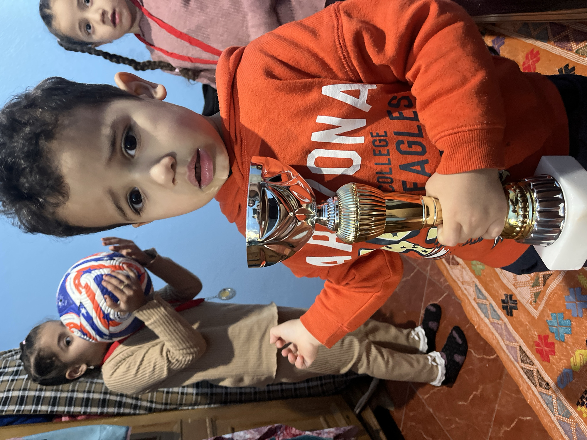 The image depicts three children indoors. A young boy wearing an orange hoodie with the words "ONOA COLLEGE EAGLES" is in the foreground, holding a gold and silver trophy. His expression suggests he is presenting the trophy. To the left and in the background, a girl is holding a multicolored ball. Another girl with braided hair is visible at the top of the image. The setting appears to be a home interior, with tiled floors and a patterned blanket visible. The city of Ouaouizert, Morocco is not explicitly visible, but its location is provided in the description.