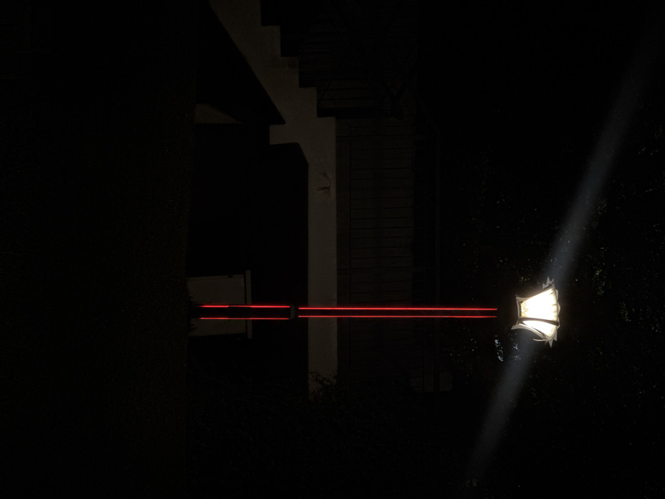 A dark outdoor scene shows a building and a street lamp. A light pole supports a lamp emitting a strong beam. Two parallel red laser lines cut across the dark space from left to right, bisecting the lamp's beam. The building's architecture is partially visible, featuring columns and a section of wall. Dense, dark foliage surrounds the scene.