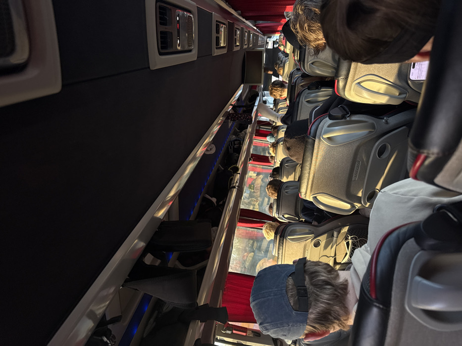 The image displays the interior of a passenger coach, viewed from the rear, looking towards the front