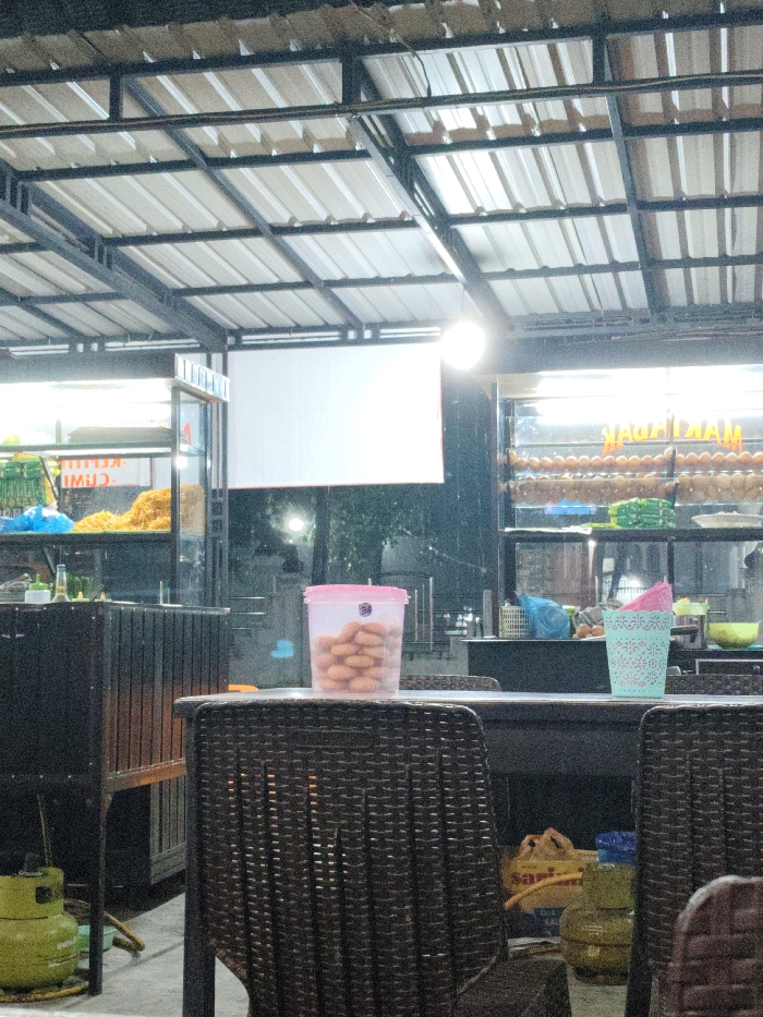 This forensic image depicts the interior of a food stall or informal restaurant located in Cut, Indonesia, during nighttime hours. The establishment features a corrugated metal roof supported by dark metal trusses, illuminated by several overhead artificial light sources. In the immediate foreground, a dark brown woven plastic chair is positioned at a dark-surfaced table. On the table, a transparent plastic container with a pink lid, marked "30," holds numerous light brown, oval-shaped cookies or snacks. Adjacent to it, a light blue, intricately patterned plastic cup contains a pink folded item, possibly a napkin. The background reveals two service counters or display cases: the left features a quantity of yellow noodles or similar dried food and a blue plastic bag, with partially legible inverted text "CUMI" on a sign; the right displays multiple horizontal rows of eggs and packaged goods behind glass, with the inverted word "MAKANAN" visible on signage within. A large, unbranded, brightly illuminated white rectangular sign is centrally located above these counters. Two green LPG gas cylinders are visible on the floor, one to the far left and another partially visible towards the right between seating. The area beyond the establishment appears dark, with distant light sources and foliage visible. No individuals are present in the frame.