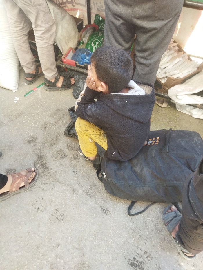 A child in a dark hoodie and yellow pants sits on a large black backpack, resting their chin on their hands. Several adults surround the child, some wearing sandals. A shopping cart filled with items sits nearby. The scene is on a cracked, concrete surface.