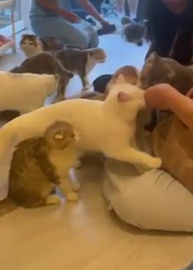 The video depicts a cat cafe. Several cats, of various colors and breeds, are gathered around a person sitting on a light-colored cushion. The person is feeding the cats a treat from their hand. Two other women are nearby, interacting with the cats. A crowd of people is visible in the background, observing the scene. The floor is a light-colored laminate. A cat tree and glass window can be seen in the background.