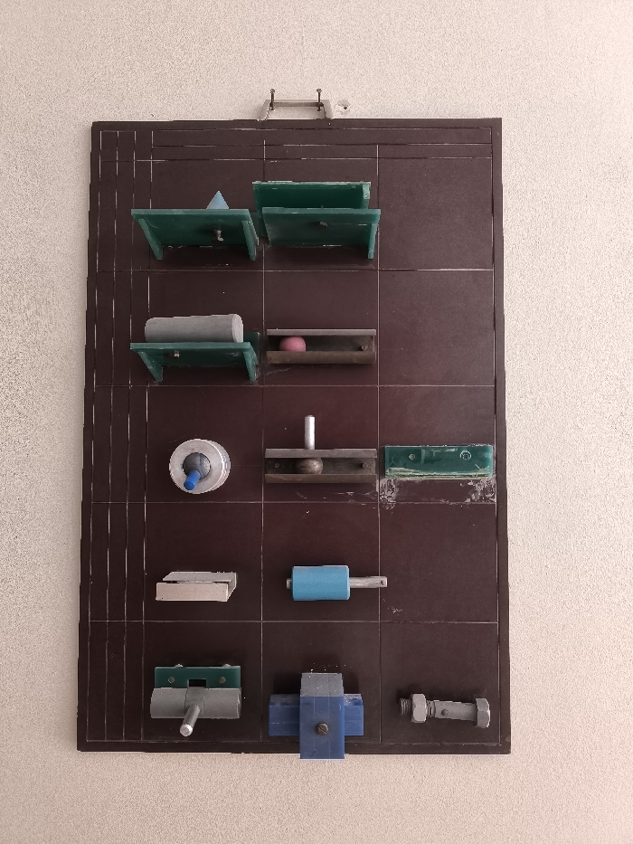 A dark brown, grid-marked activity board is affixed vertically to a textured, light beige wall in the city of Sliven, Bulgaria. A metal clip is attached to the top edge of the board. The board displays various manipulative objects arranged in five horizontal rows: * **Row 1 (Top):** A translucent light blue conical object rests on a dark green L-shaped bracket. To its right, two additional dark green L-shaped brackets are mounted side-by-side, appearing empty. * **Row 2:** A gray cylindrical object is horizontally positioned on a dark green L-shaped bracket. To its right, a small pink spherical object is contained within a dark brown U-shaped channel. * **Row 3:** A circular silver object with a blue cylindrical insert is mounted on the left. Adjacent to it, a vertical silver rod protrudes from a wooden block, which appears to house a spherical component. Further right, a rectangular dark green plastic piece with visible adhesive residue is attached. * **Row 4:** A silver rectangular block or bracket is mounted on the left. To its right, a light blue cylindrical roller with a silver axle is affixed horizontally. * **Row 5 (Bottom):** A small dark green rectangular bracket is positioned above a gray block securing a horizontal silver rod on the left. In the center, a multi-part light blue plastic mechanism resembling a clamp or hinge is fastened by a dark screw. On the far right, a silver metallic bolt with an attached hexagonal nut is mounted horizontally.