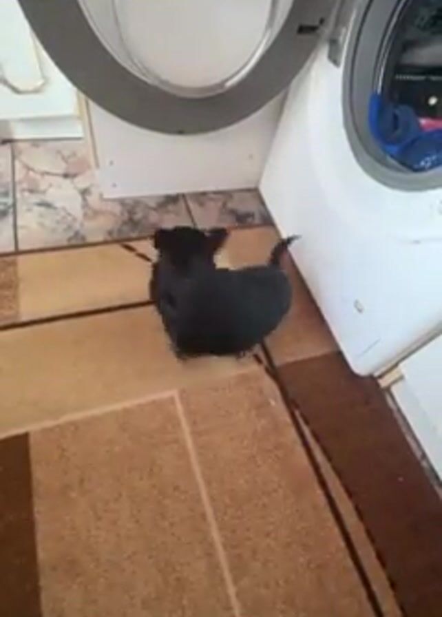 small, black and brown Chihuahua-like dog standing on a brown carpet next to an open washing machine