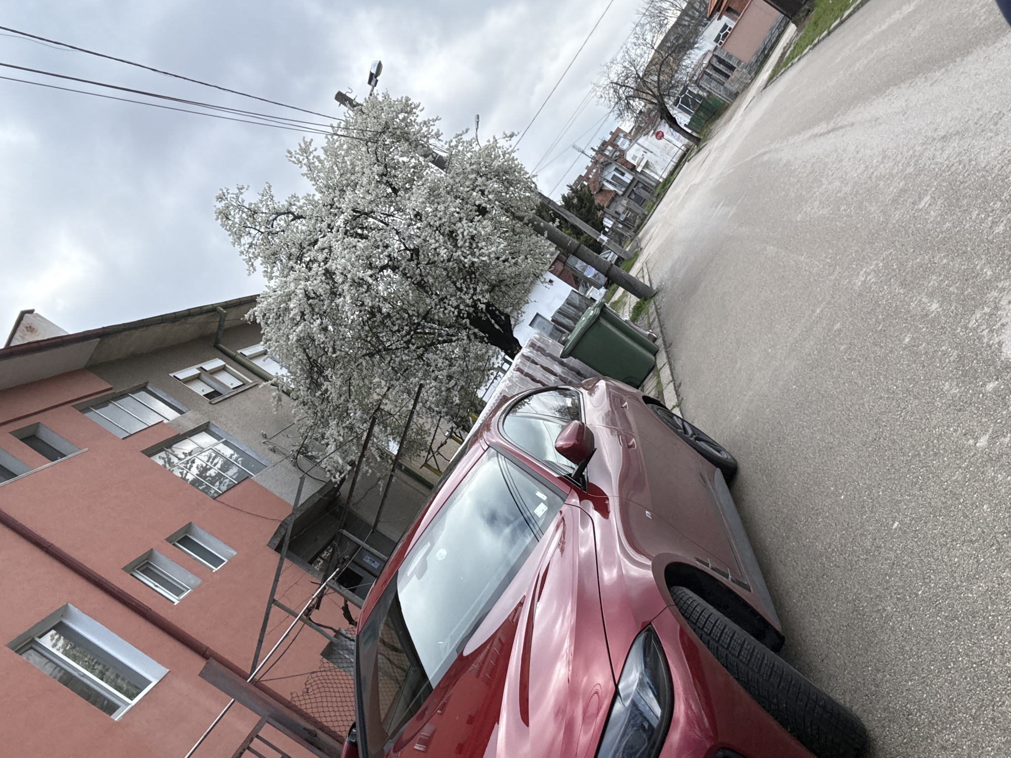 A red car is parked on the side of a street next to a building with a pinkish-red facade. A flowering tree is visible behind the car. The road is paved. There is a green trash bin on the other side of the road. The sky is overcast. The general area is likely residential. While a precise location is not discernible from the image, it portrays urban features common in Vidin, Bulgaria.