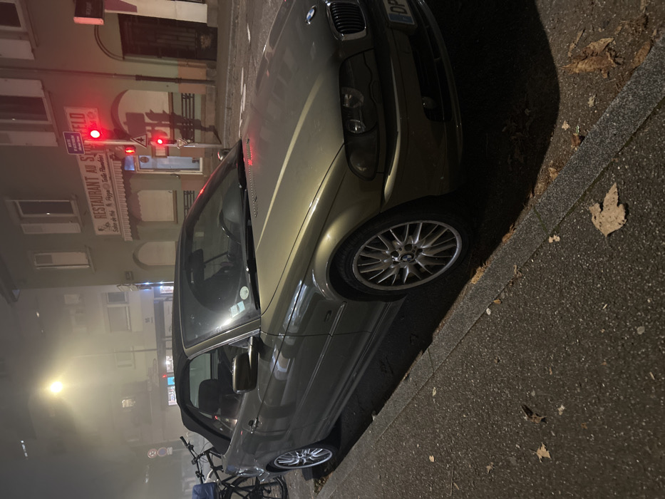 A static nighttime scene, enveloped in fog or haze, is depicted on Rue du Faubourg National in Strasbourg, France. The central subject is a dark olive green BMW E46 3 Series convertible, with its black fabric roof closed, parked parallel to the curb on the right side of the street. The vehicle displays a French license plate beginning with "DP" on its front bumper and features multi-spoke silver alloy wheels. In the background, on the right side of the street, a multi-story building houses the "RESTAURANT AU SAINT-WOLFD" (or "SAINT-WOLFELD"), indicated by an illuminated sign with smaller text for "Salon de thé," "Pizza," and "Salle familiale." At an adjacent intersection, a vertical traffic light pole exhibits a solid red signal at its top and a smaller red signal below, accompanied by a white square sign bearing the numeral "4." A partial blue street sign confirming "RUE DU FAUBOURG NATIONAL" is also visible. Further left and slightly behind the BMW, a dark-framed bicycle with a front basket is parked on the sidewalk. Streetlights emit a bright, diffused yellow-white glow through the hazy conditions, illuminating the urban environment. The ground consists of asphalt paving on the street and sidewalk, separated by a curb. Scattered brown, dry leaves are present on both surfaces, particularly near the curb. No individuals are visible within the frame.