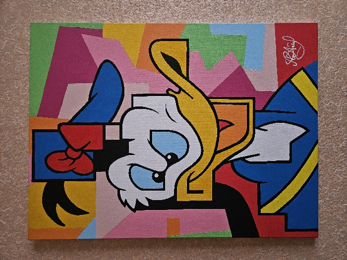 - "A vibrant, vertically oriented canvas painting depicting a stylized, cubist-influenced rendition of Donald Duck is displayed" by FM-ktMME3, licensed under CC BY 4.0