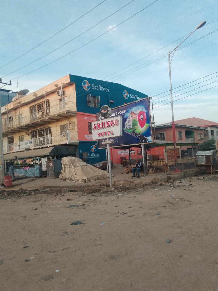 - "A street view depicts a multi-story building adorned with "StarTimes" branding and an "Amiingo Hotel" sign" by FM-lXmRa2, licensed under CC BY 4.0