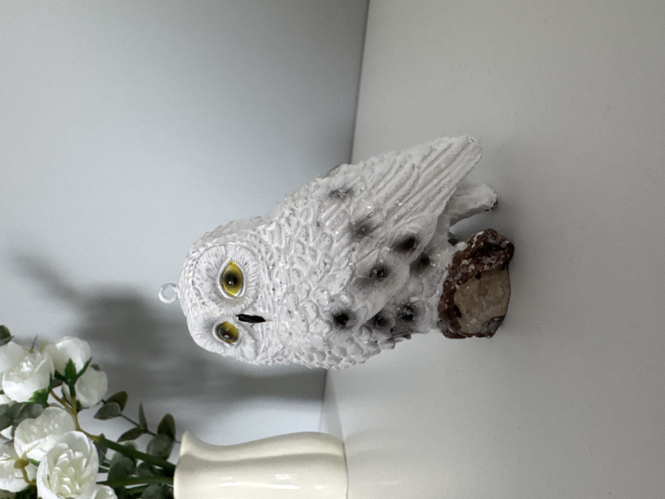 In Zhiten, Bulgaria, an indoor scene displays a white owl figurine centered on a smooth, light-colored surface. The figurine, crafted from a material resembling resin or ceramic, is predominantly white with a subtle glitter finish, featuring bright yellow eyes with black pupils and sporadic dark grey or black speckles across its chest. It stands on a small, irregular base mimicking a reddish-brown and tan rock formation. A small white hanging loop is present at the top of the owl's head. To the left and slightly out of focus, a cream-colored fluted vase holds several artificial white flowers with green stems. The background is a plain, light grey wall.