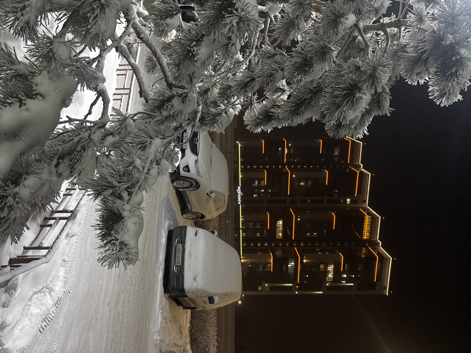 The image depicts a winter night scene in Krasnoyarsk, Russia, looking towards the "Nesterov" residential complex. In the foreground, prominent branches of a coniferous tree, likely a pine, are heavily covered in fresh snow and hoarfrost, dominating the left and lower portions of the frame. A snow-covered dark metal railing is partially visible beneath the tree branches, extending diagonally towards the right. The midground features a snow-covered parking area with two vehicles parked side-by-side. On the left is a white Mazda CX-5 SUV, partially obscured by a layer of snow, with a visible Russian license plate reading 'M 900 YX 24'. To its right, a silver-grey minivan, fully blanketed in a thick layer of snow, displays a Russian license plate 'A 682 HB 01'. The ground of the parking lot and surrounding areas is covered in deep snow, with visible tire tracks in the snow leading away to the right. In the background, a large, modern high-rise building complex, consisting of multiple dark towers, stands illuminated against the night sky. The building's facade features distinctive horizontal orange LED strip lighting and vertical white accent lighting, with additional white lighting along its roofline. The word "NESTERCV" is visibly illuminated in capital letters on the lower part of the building's facade. The dark sky and pervasive snow cover indicate sub-zero temperatures and recent or ongoing snowfall.