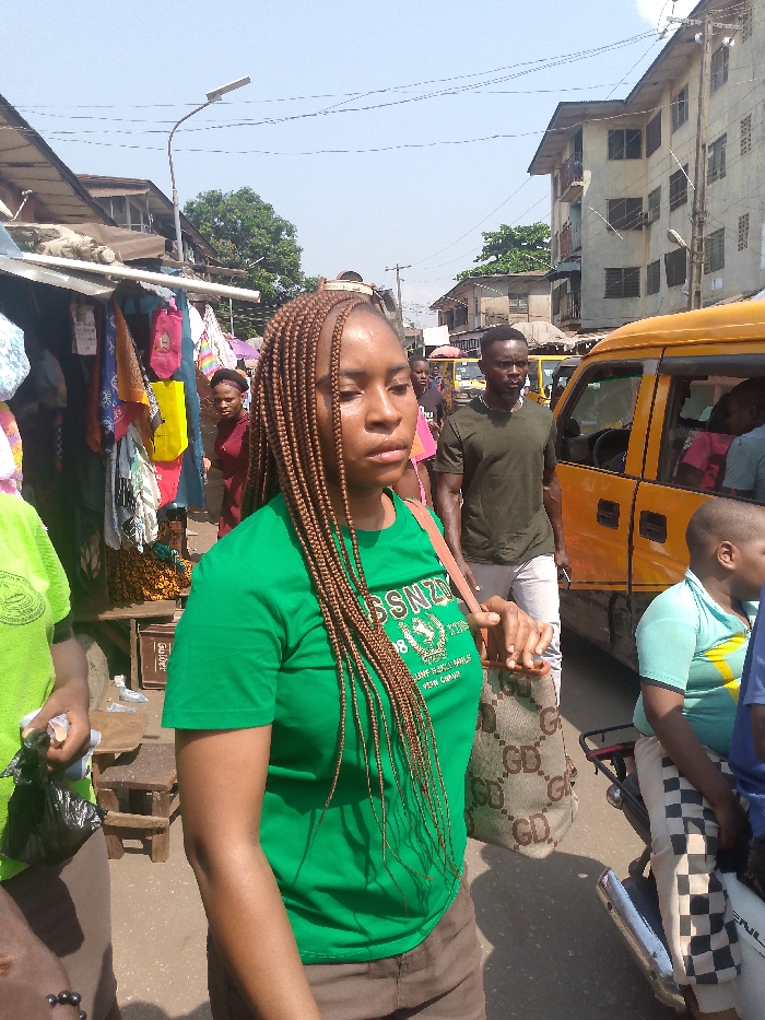 The image captures a bustling street scene in a commercial area of Onitsha, Nigeria, under a clear daylight sky. In the immediate foreground, a young adult female with light brown box braids extending to her chest wears a bright green t-shirt featuring a white graphic design that includes "SSNZO 1998" and "LIVE YOUR DREAMS." She is positioned slightly to the right of the camera, carrying a patterned handbag with "GD" logos on her right side. To her left, partially visible, another individual in a light green shirt holds a black plastic bag. In the middle ground, a young adult male with short dark hair, dressed in a dark olive green t-shirt and light-colored trousers, walks towards the camera. Behind him and to the right, a yellow passenger minivan, possibly a commercial taxi or bus, is present with visible occupants. Further right, a young boy in a light blue and yellow t-shirt and checkered pants is seated on a motorcycle or tricycle. The left side of the scene features an open-air market stall displaying various brightly colored garments. Multi-story buildings, some appearing weathered, line the street in the background. Overhead power lines and a street light are visible against the blue sky. The ground surface is indistinct but suggests a well-used thoroughfare.