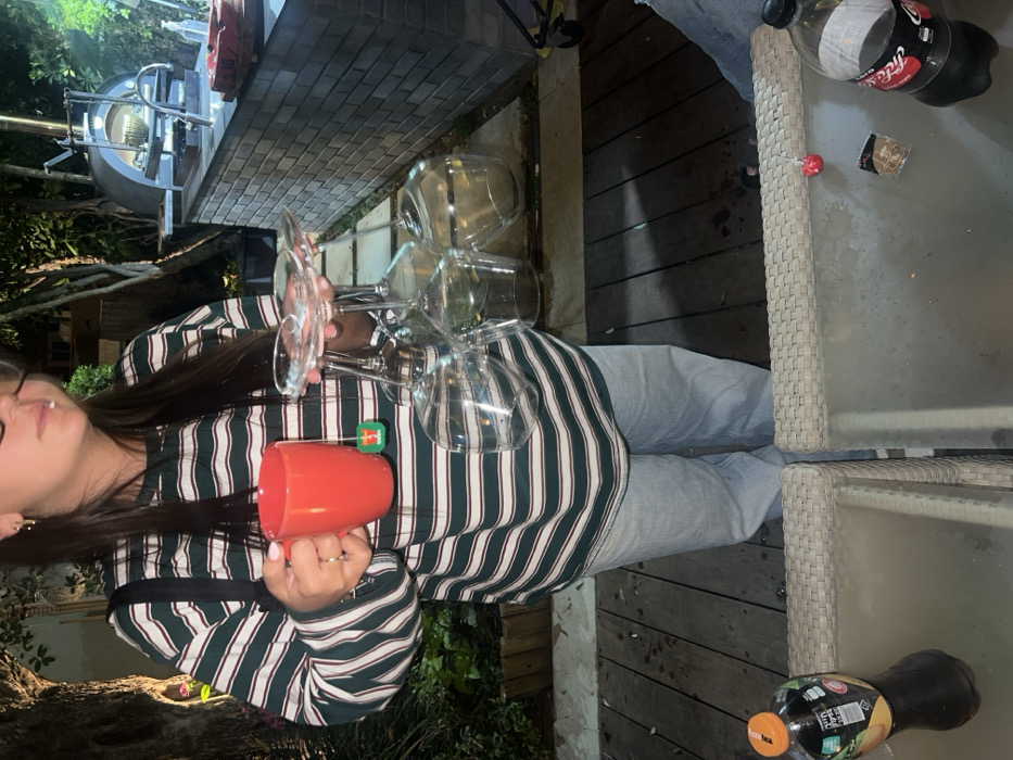 An outdoor evening scene features an individual standing on a wooden plank deck in what appears to be a backyard or patio area. The person, seen from the mid-torso down, wears a long-sleeved shirt with horizontal dark green, white, and thin red stripes, and light blue jeans. They are holding a solid red mug in their left hand, from which a small green and red tag hangs. In their right hand, they hold a clear glass holder suspending four inverted wine glasses. The individual wears glasses. In the background, a permanent outdoor kitchen is visible, constructed with light brown bricks. It features a dark grey dome-shaped pizza oven, a sink with a faucet, and a countertop with a red cutting board displaying unidentified red items. Lush green foliage and trees are present, illuminated by artificial lighting. In the foreground, two light-colored wicker-style outdoor tables with clear tops are situated. On the left table, a plastic bottle of Tempo Orange Mango soda with Hebrew labeling is visible. On the right table, a plastic bottle of Coca-Cola Zero with Hebrew labeling, a small red foil-wrapped candy, and a crumpled wrapper are present. A portion of another person's leg and foot is partially visible on the far right, suggesting additional individuals are present, seated at the tables. The scene is located in Rishon LeZion, Israel.