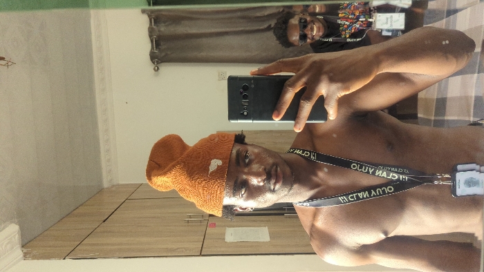 An indoor mirror selfie taken in Narayi, Nigeria, displays two male individuals. The primary subject, positioned in the foreground, is a shirtless male with dark skin, wearing an orange knit beanie featuring a white emblem and a black lanyard with a white ID card holder. He holds a dark-colored smartphone with a prominent camera array in his right hand, capturing his reflection. His expression is neutral, and his gaze is directed towards the camera. His skin appears slightly moist or reflective. In the background, partially obscured by the primary subject's arm and phone, a second male individual is reflected. He wears dark sunglasses, a dark t-shirt with a multi-colored graphic design, and a lanyard with an ID card. This individual is smiling broadly. The surrounding environment includes light-colored walls, a ceiling with decorative molding, dark grey curtains on the right, and light wood-grain cabinets with dark handles on the left, with a piece of paper taped to one cabinet door.