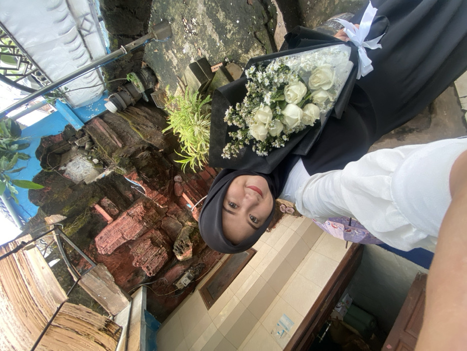 - "A woman wearing a hijab, black graduation gown, and white shirt, is holding a bouquet of white roses and baby's breath wrapped in black paper with a white ribbon" by FM-htxI33, licensed under CC BY 4.0