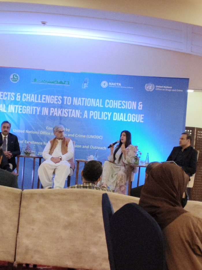 The image depicts an indoor policy dialogue event in a conference setting in Islamabad, Pakistan. Four individuals are seated on light brown armchairs on an elevated platform, positioned against a prominent blue banner. The banner prominently displays the title "ASPECTS & CHALLENGES TO NATIONAL COHESION & NATIONAL INTEGRITY IN PAKISTAN: A POLICY DIALOGUE," along with logos for the Government of Pakistan, NACTA (National Counter Terrorism Authority), and the United Nations Office on Drugs and Crime (UNODC), indicating the event's theme and key organizers. Text below specifies "Co-organized by United Nations Office on Drugs and Crime (UNODC) and National Centre of Excellence for Counter Violent Extremism, Research and Outreach." From left to right on the panel: a man with dark hair and a mustache wears a dark suit and tie; an older man with grey hair and a beard wears a white shalwar kameez under a light brown waistcoat; a woman with dark hair wears a light-colored floral patterned dress, holding a microphone to her mouth with her right hand and gesturing with her left; and a man with dark hair and a light mustache wears a dark long-sleeved shirt. Small wooden side tables positioned between the panelists hold clear water bottles. The foreground shows a partial view of the audience, out of focus. This includes the back of a male's head wearing a plaid shirt, a person wearing a brown hijab, and segments of light brown upholstered seating and a dark blue chair. The background behind the stage features light-colored walls, with a brown wooden lattice screen visible to the right of the banner. The ceiling is white with visible recessed lighting, providing bright illumination to the scene.