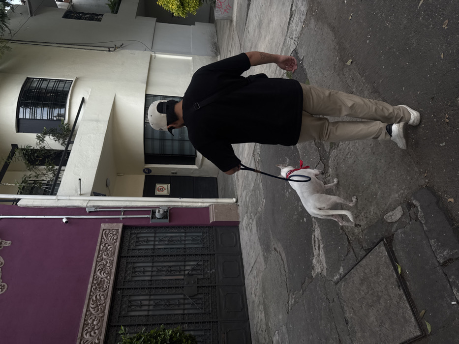 A person wearing a black shirt, khaki pants, white sneakers, and a cap is walking a white dog on a leash. The dog has a red bandana tied around its neck. They are on a sidewalk next to a street and buildings. One building is purple with a decorated gate, and another is white with black-barred windows and a balcony. The scene appears to be in an urban setting.