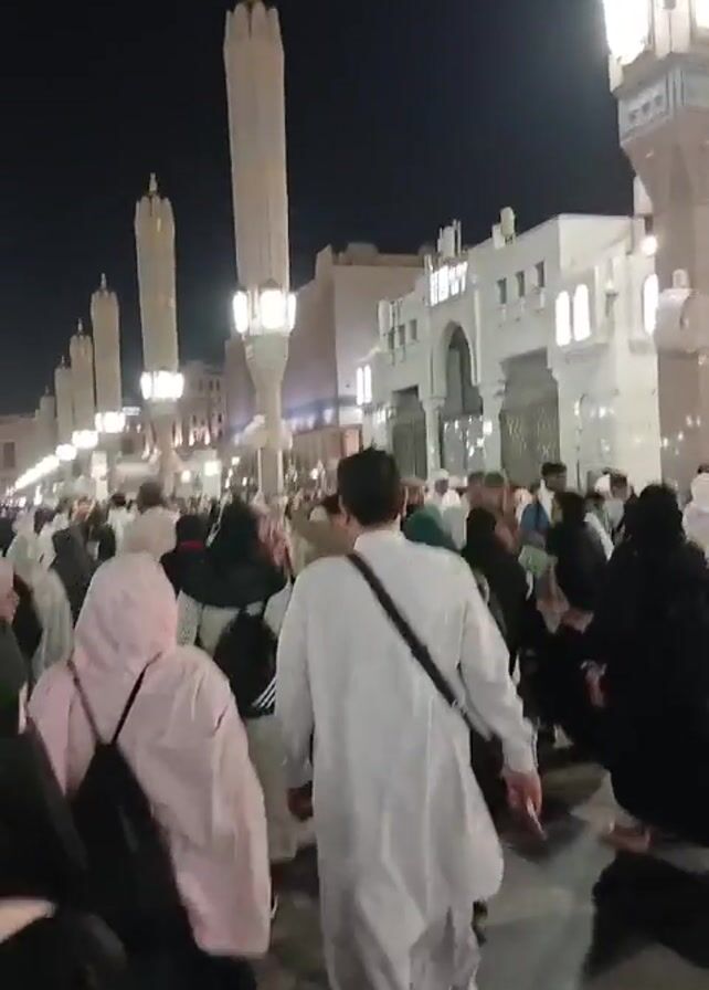At night, a dense crowd of people walks on a wide, illuminated path. The majority appear to be wearing traditional Muslim attire, including robes and headscarves in various colors. The camera moves with the crowd, focusing on the backs of the people. Tall, white, ornate minarets line the path, lit up against the night sky. The buildings flanking the path are white and constructed with arched entrances and windows. The overall atmosphere is crowded and brightly lit.